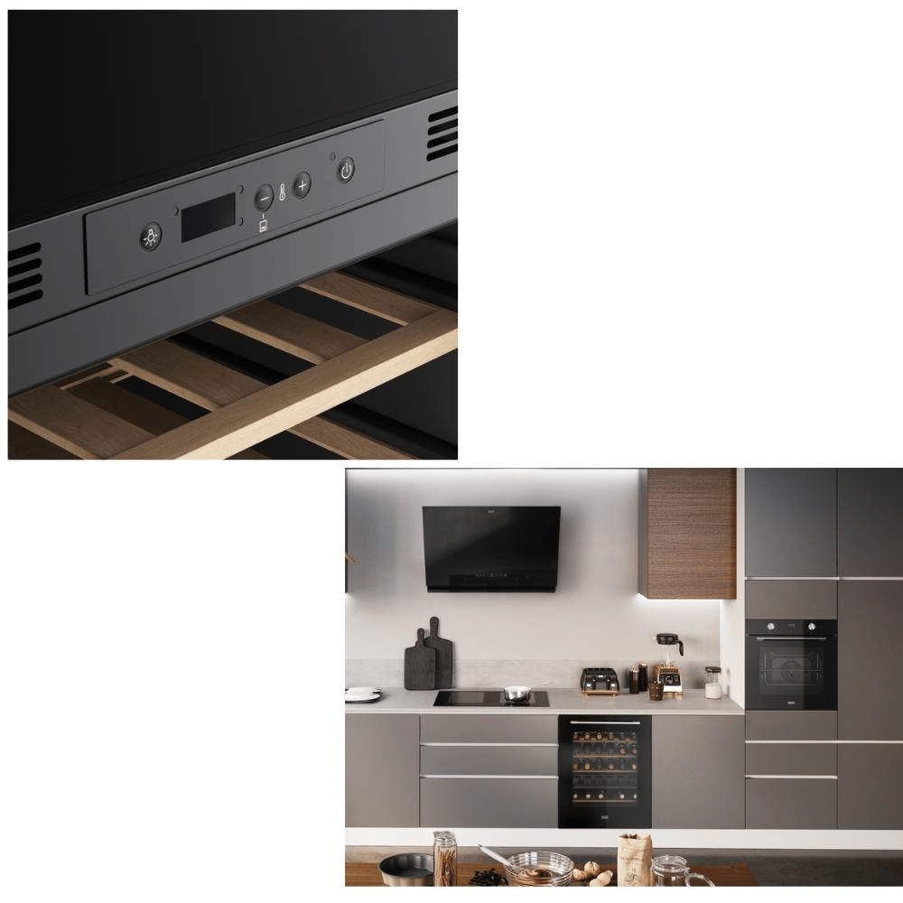 Modern, siyah cam kapak tasarımı; mutfaklarda şık ve minimal bir görünüm oluştururken, çift sıcaklık bölgesi sayesinde farklı şarap türlerini aynı anda optimum derecelerde muhafaza etmenize olanak tanır. Kayın ağacından yapılmış sürgülü raflar, şişelerin titreşimini azaltır ve şarabın olgunlaşma sürecini destekler.