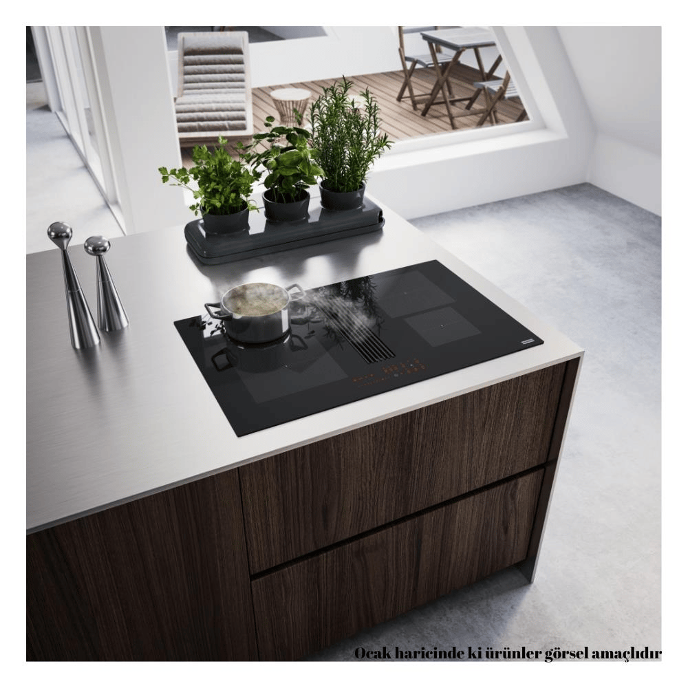 Modern mutfak tasarımının yeni standardı: Franke Maris 2gether, indüksiyon ocak ve davlumbaz fonksiyonunu tek yüzeyde birleştirerek kullanım kolaylığı, estetik ve kompakt yerleşim sunar. 83 cm genişliğindeki siyah cam yüzeyi, minimal ve şık görünümü güçlendirirken, yüksek çekiş gücüne sahip entegre aspiratör sistemi pişirme sırasında oluşan buhar ve kokuyu kaynağında yok eder. Böylece mutfağınızda ferah ve temiz bir hava sağlar.