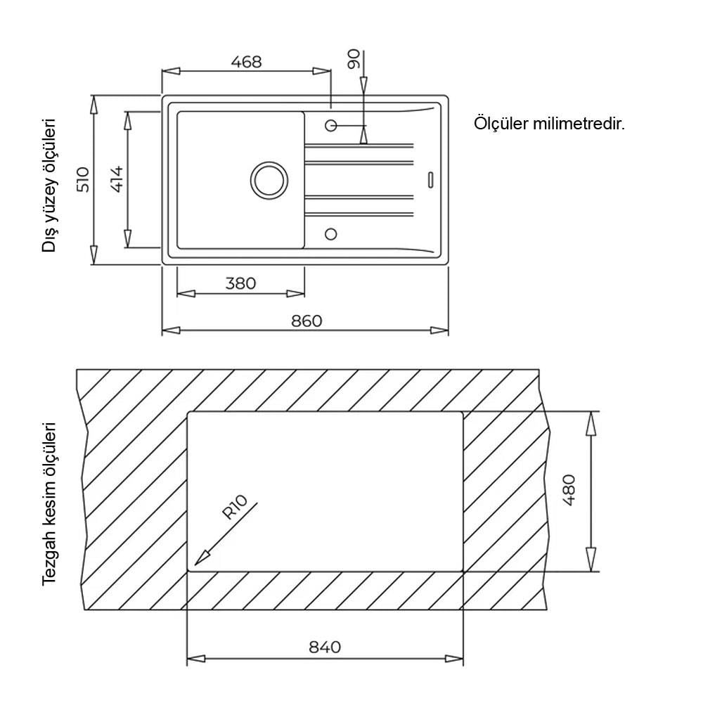 Önemli Not: Evye ürünlerinin montajı için tezgahınızda eviye ölçülerine uygun kesilmiş montaj alanı olmalıdır. Tezgahınızın montaj için gerekli yeterlilikleri sağlayacak bir malzemeden yapılmış olması ve evyeyi taşımaya uygun kalınlıkta olması gereklidir. Evye montajı ve seçimi konusunda bilginiz yok ise mutlaka satış temsilcilerimiz ile birlikte ürün seçimi yapınız.