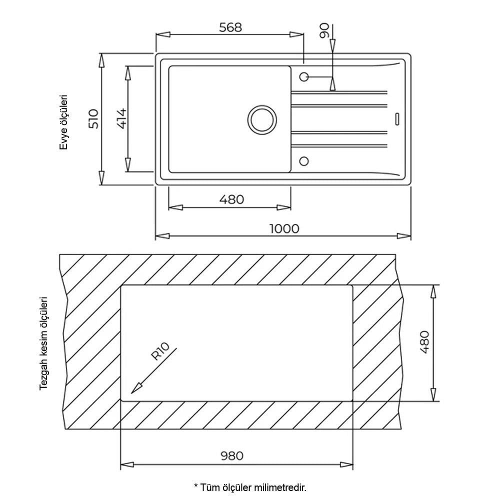 Önemli Not: Evye ürünlerinin montajı için tezgahınızda eviye ölçülerine uygun kesilmiş montaj alanı olmalıdır. Tezgahınızın montaj için gerekli yeterlilikleri sağlayacak bir malzemeden yapılmış olması ve evyeyi taşımaya uygun kalınlıkta olması gereklidir. Evye montajı ve seçimi konusunda bilginiz yok ise mutlaka satış temsilcilerimiz ile birlikte ürün seçimi yapınız.