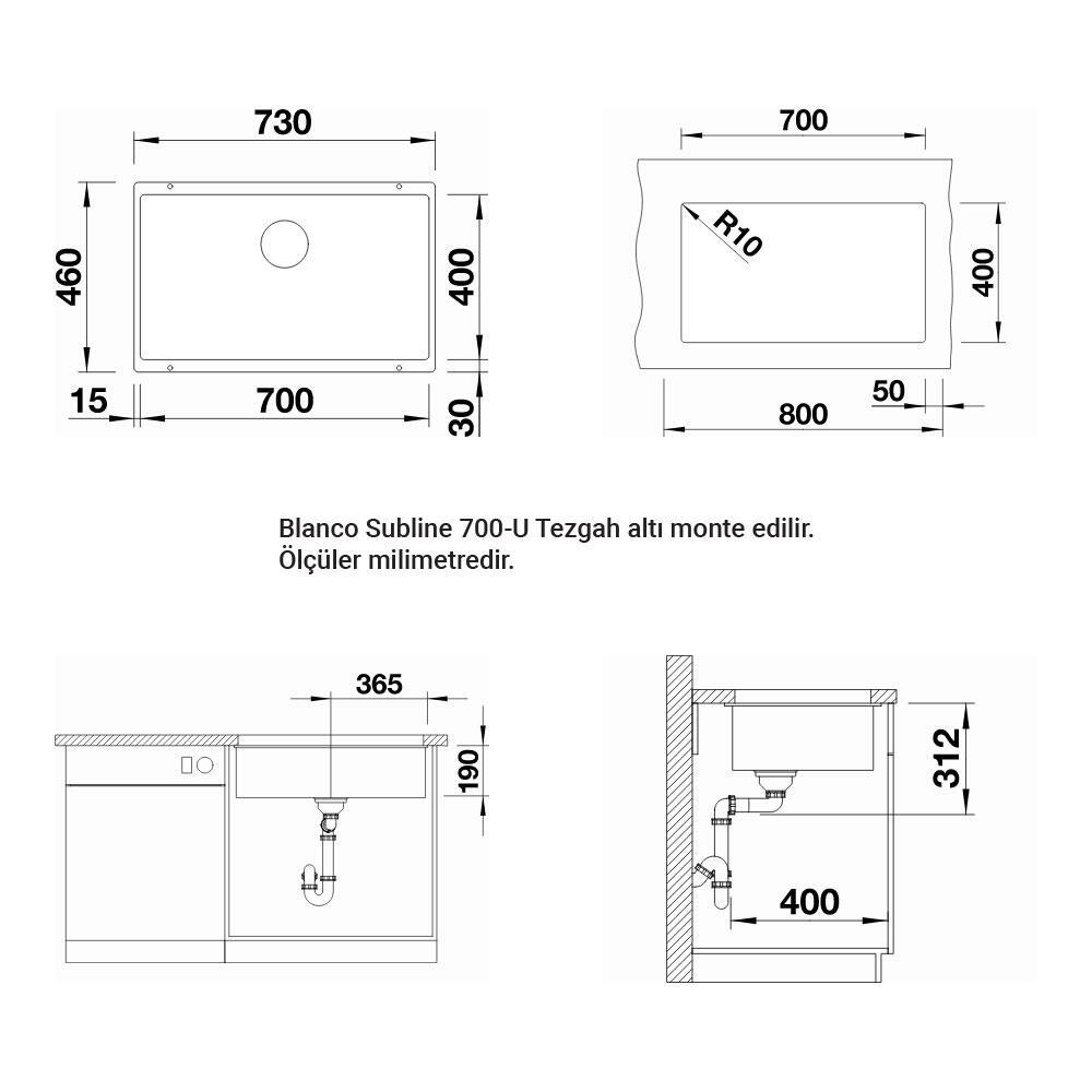 Tezgah kesim ölçüleri: 700 x 400 mm, köşeler R10 radüslü