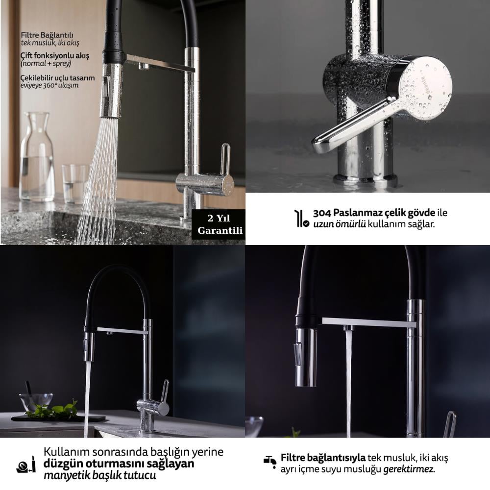 Çekilebilir ve esnek uç yapısı, evyenin her noktasına rahat erişim sunar. Çift fonksiyonlu akış sistemi sayesinde normal akış ve sprey modu arasında kolayca geçiş yapabilir; hem hassas yıkama hem de güçlü durulama işlemlerini tek ürünle gerçekleştirebilirsiniz.