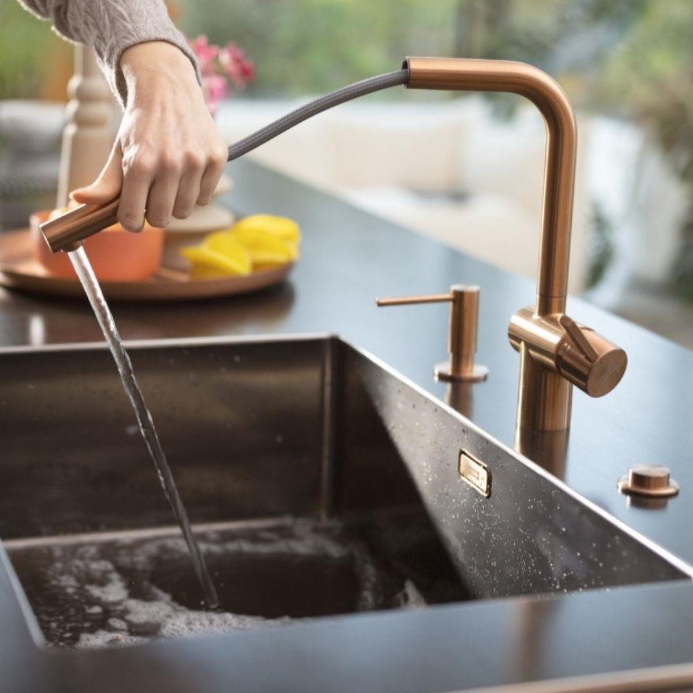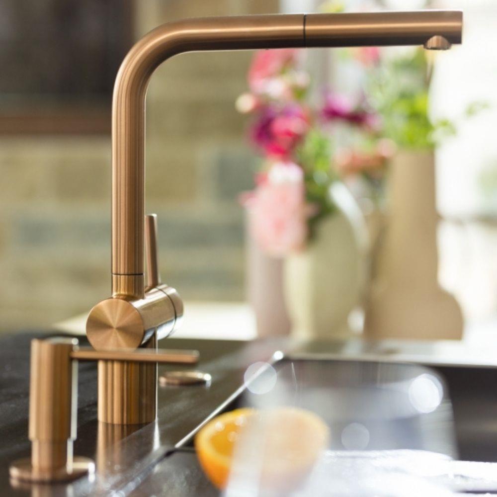 Mutfak tasarımınıza zarif bir dokunuş katacak olan Franke L-Kuğu Spiral Musluk, şık Bakır Rengi ve dayanıklı paslanmaz çelik 304 malzemesi ile hem uzun ömürlü kullanım hem de modern bir görünüm sunar. Esnek gri bağlantı borusu ve paslanmaz çelik duşlama sistemi sayesinde suyun akışını kolayca yönlendirebilirsiniz.