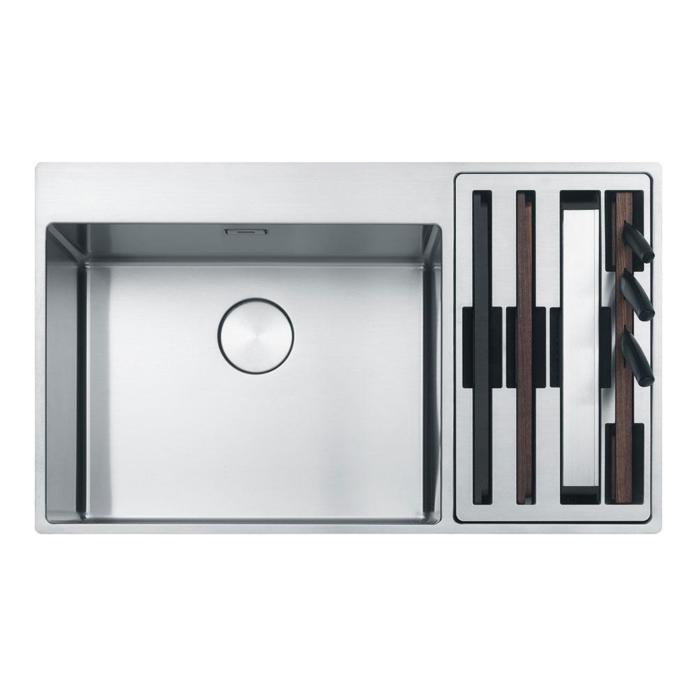 Tezgah üstü veya tezgaha sıfır kullanıma uygun kenar profilli, tam aksesuarlı paslanmaz çelik mutfak işleri merkeziniz. İkinci hazne, aksesuarlar için saklama yeri olarak işlev görür.