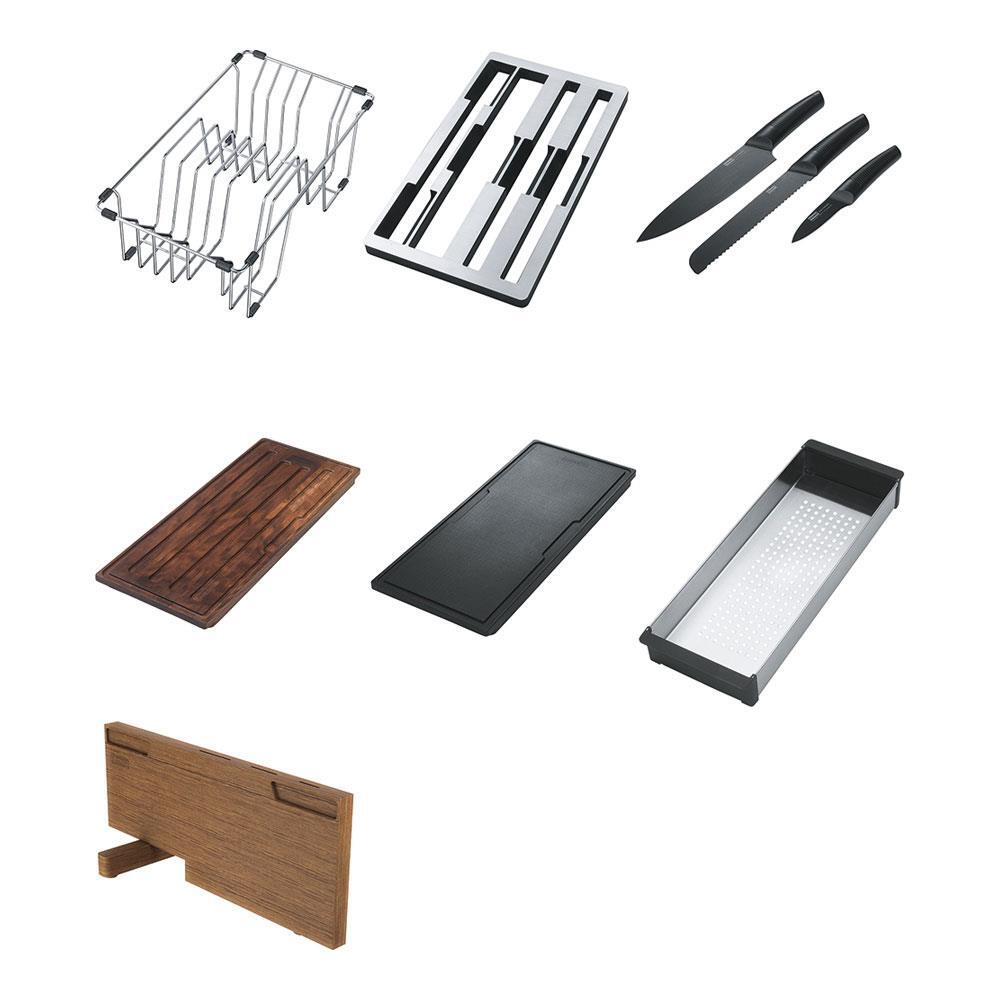 Aksesuar seti içeriği; Kurutma rafı, Çelik süzgeç, 3lü bıçak seti, Ahşap bıçaklık, Polietilen kesme tahtası ve Ahşah kesme tahtasından oluşmaktadır.