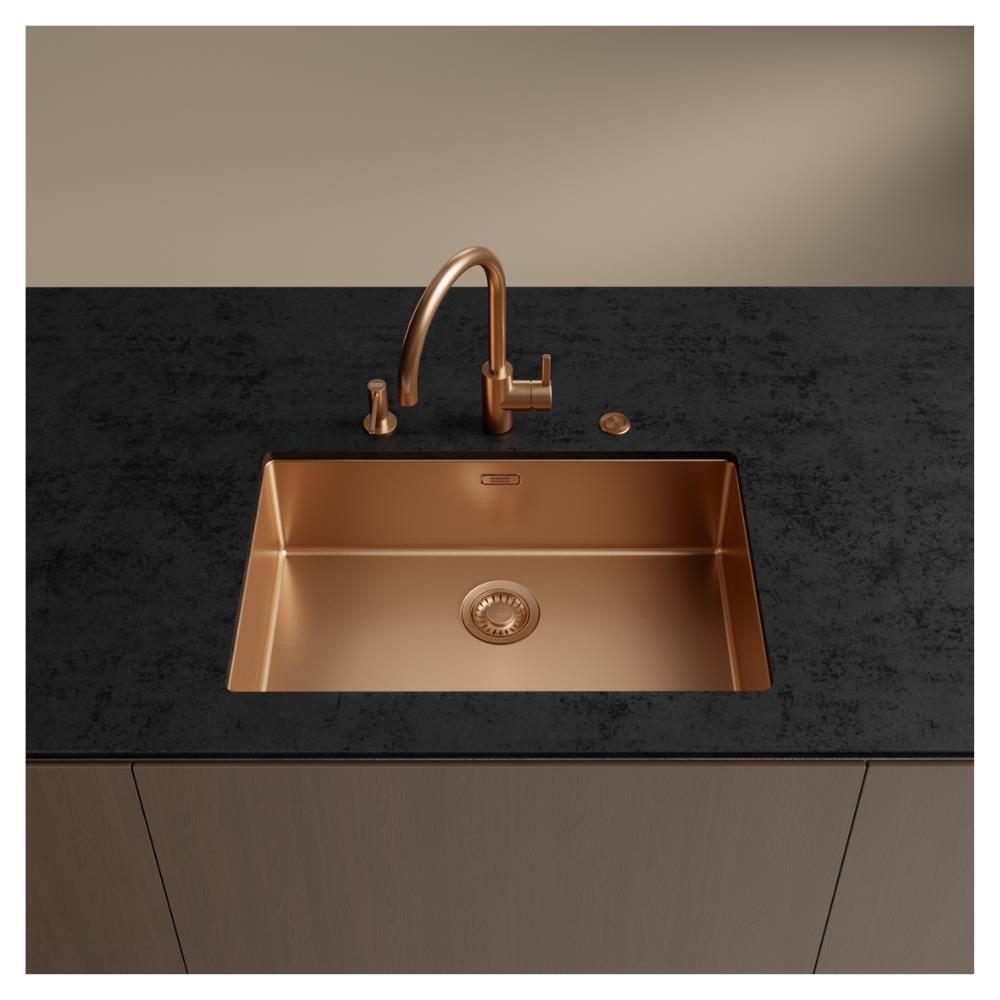 Franke’nin prestijli Mythos Masterpiece serisine ait BXM 210/110-68 Copper eviye, modern mutfaklarda hem şıklığı hem de dayanıklılığı bir arada sunar. PVD kaplama bakır rengi, çizilmeye karşı yüksek direnç sağlar ve mutfaklara sıcak, lüks bir görünüm kazandırır. Tek hazneli ve damlalıksız yapısıyla minimal tasarım seven kullanıcılar için ideal bir seçimdir.