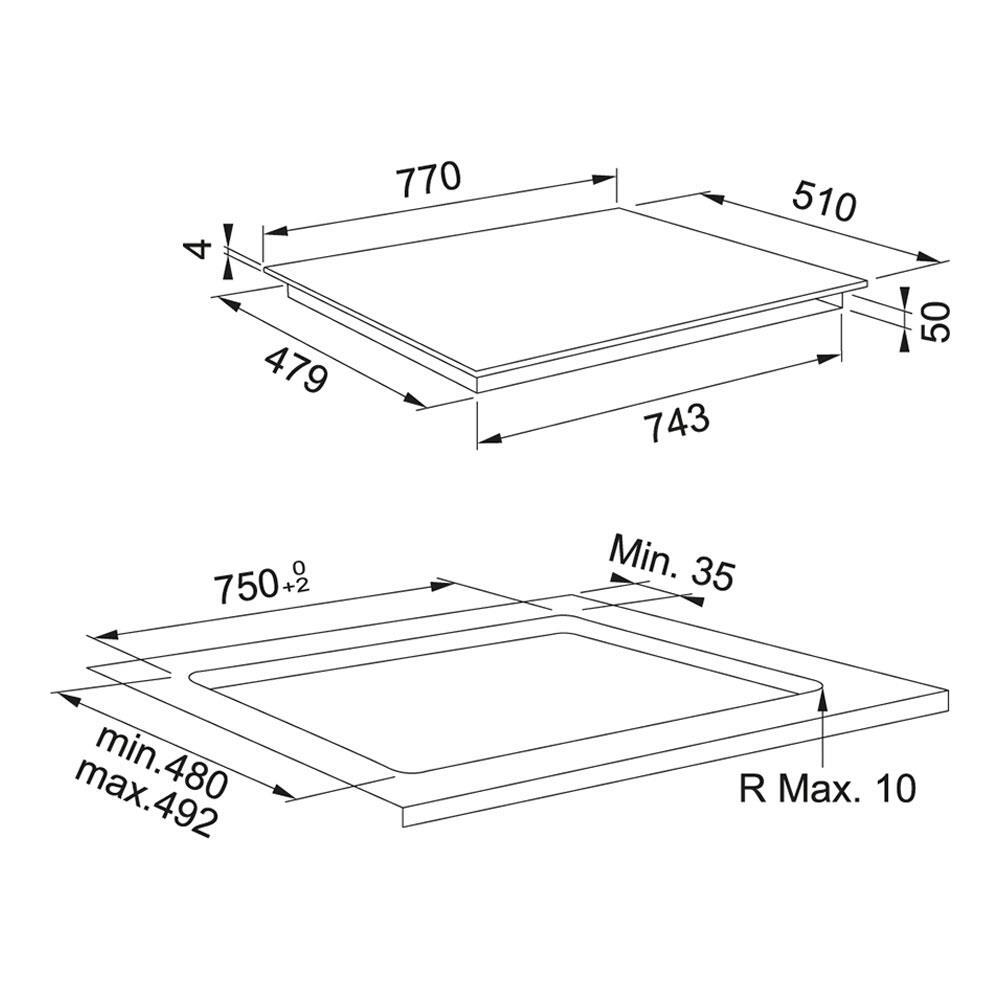 Montaj ölçüsü: 750 x 480-492 mm, R10 radüslü kenar,