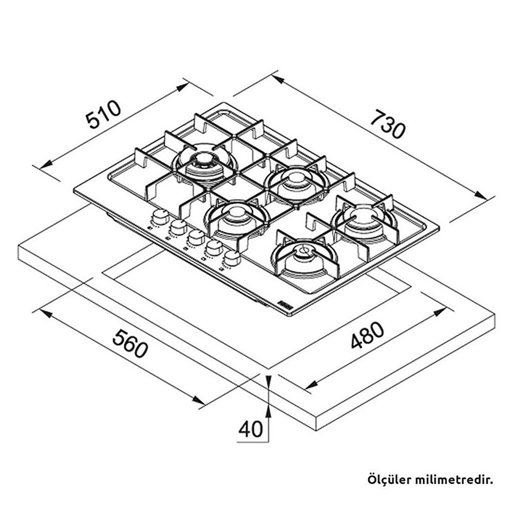 Bu ürün en az 60 cm genişliğindeki alt dolaplar ile kullanıma uygundur. Kurulum Franke servisleri tarafından ücretsiz olarak yapılmaktadır. Montaj alanı, doğalgaz ve elektrik tesisatı kurulumdan önce hazırlanmalıdır.