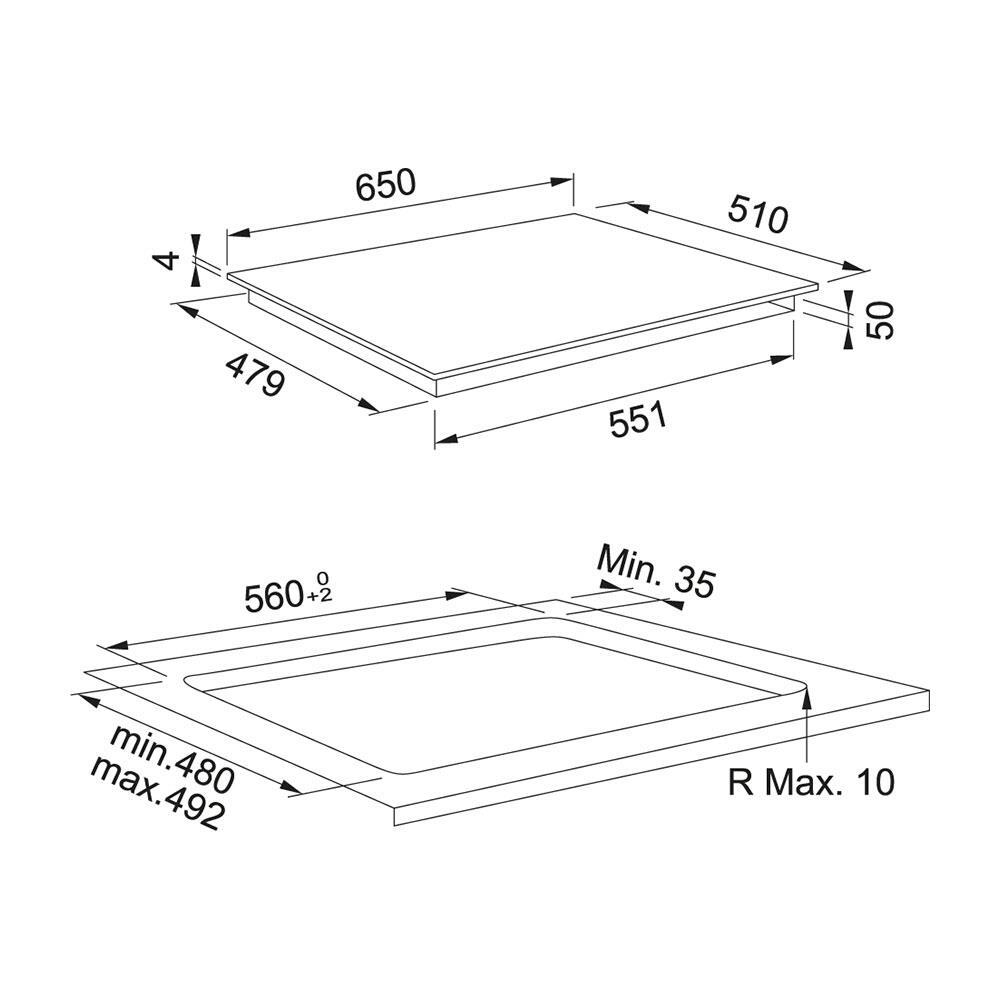 Montaj ölçüsü: 560 x 480-492 mm, R10 radüslü kenar,