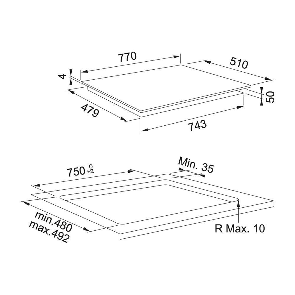 Montaj ölçüsü: 750 x 480-492 mm, R10 radüslü kenar,
