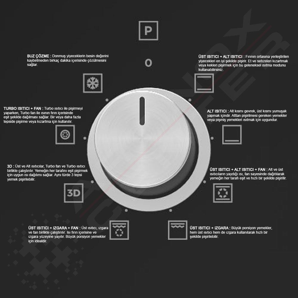 Üst ısıtıcı + Alt ısıtıcı, Alt ısıtıcı, Üst ısıtıcı + Alt ısıtıcı + Fan, Üst ısıtıcı + Izgara, Üst ısıtıcı + Izgara + Fan, 3D (Üst ve Alt ısıcılar + Fan + Turbo ısıtıcı), Turbo ısıtıcı + Fan, Buz çözme