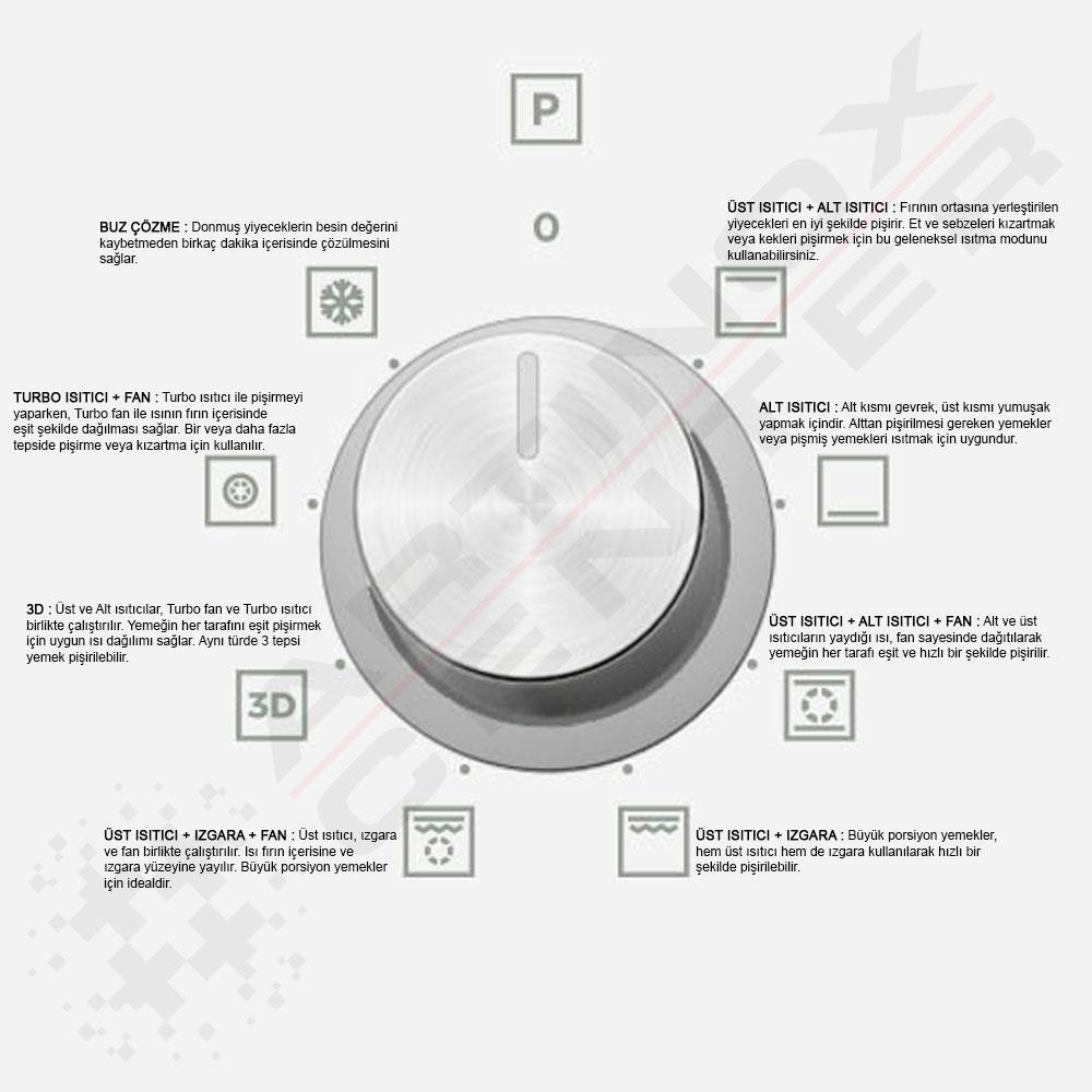 Üst ısıtıcı + Alt ısıtıcı, Alt ısıtıcı, Üst ısıtıcı + Alt ısıtıcı + Fan, Üst ısıtıcı + Izgara, Üst ısıtıcı + Izgara + Fan, 3D (Üst ve Alt ısıcılar + Fan + Turbo ısıtıcı), Turbo ısıtıcı + Fan, Buz çözme