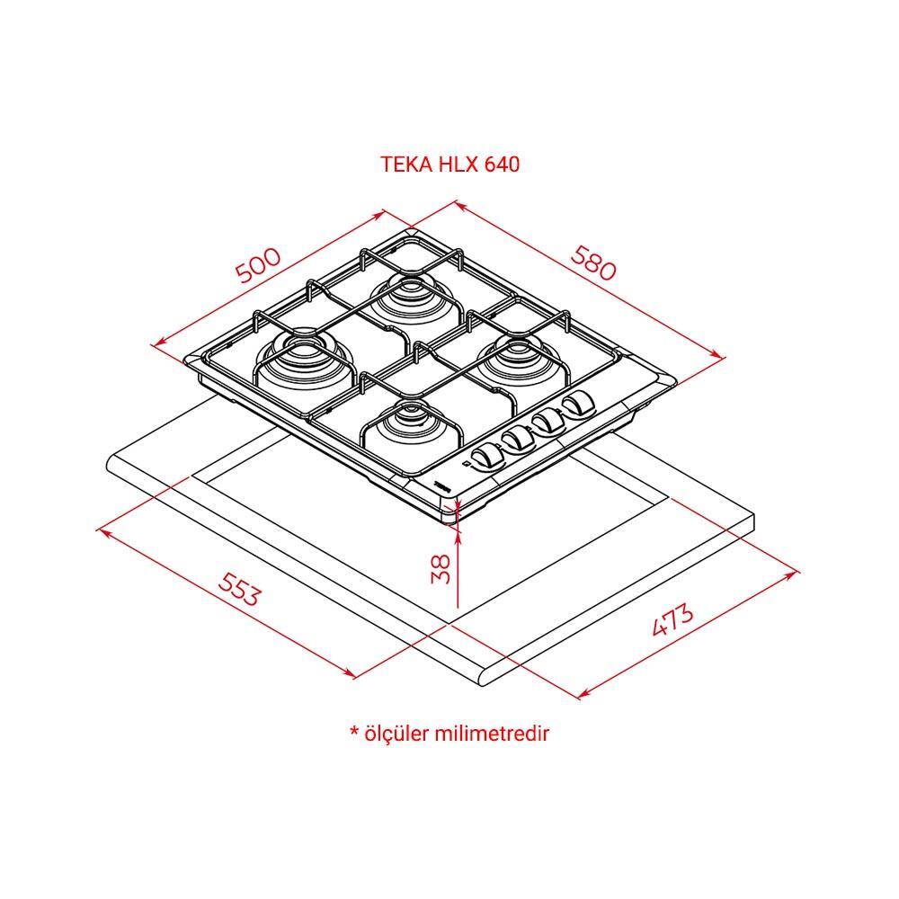 · 580x500 milimetre yüzey ölçüsü, 553x473 milimetre tezgah kesim ölçüsü (ürün görselleri arasındaki teknik çizimi inceleyiniz),
