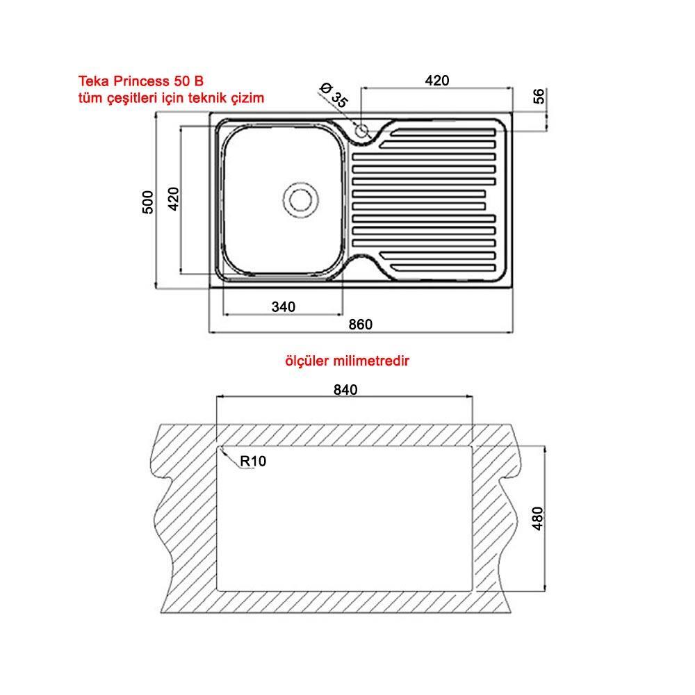 Teka Princess 50 B Paslanmaz Çelik Evye, Sağ damlalıklı, Inox yüzey, Tek hazneli,