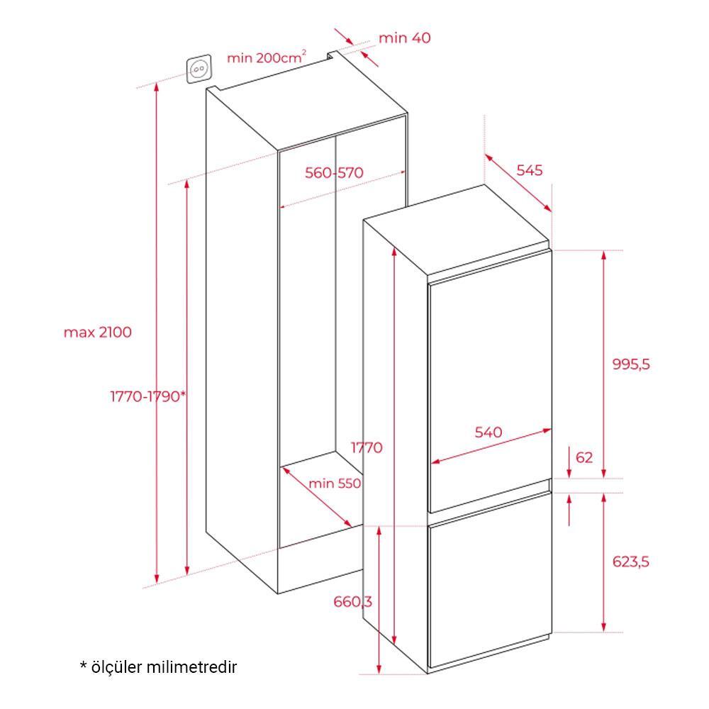* Bu ürün ankastre kullanıma uygun olup dış yüzeyine mobilya kapak monte edilmektedir. Mobilya kapaklar ürünlere dahil değildir. Mutfağınızda mobilya ankastre buzdolabı modülü var ise kullanabilir veya ürüne uygun mobilya ankastre modülü yaptırabilirsiniz. Ankastre ürünler hakkında bilginiz yok ise satın almadan önce mutlaka satış danışmanlarımız ile iletişime geçmenizi rica ederiz.
