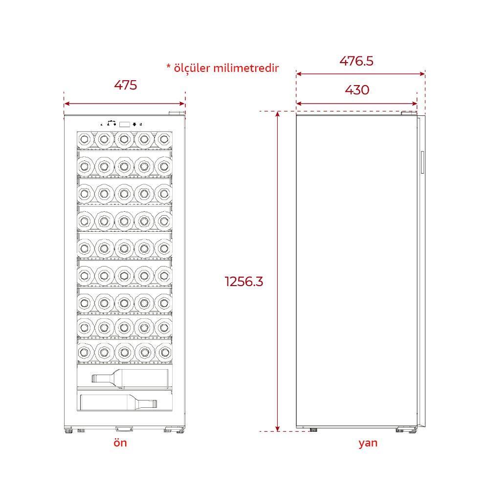 - Yükseklik 1256 mm, Genişlik 477 mm, Derinlik 475 mm,