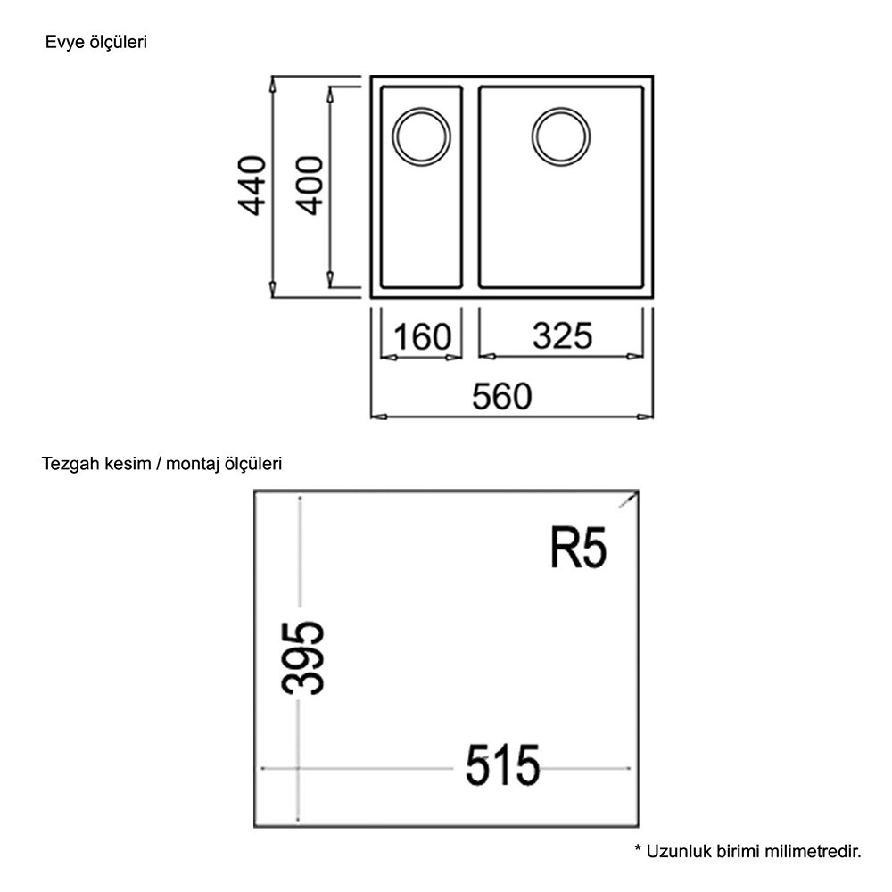 + 51,5 x 39,5 cm montaj (tezgah kesim) ölçüsü, Köşeler R5 radüslü,