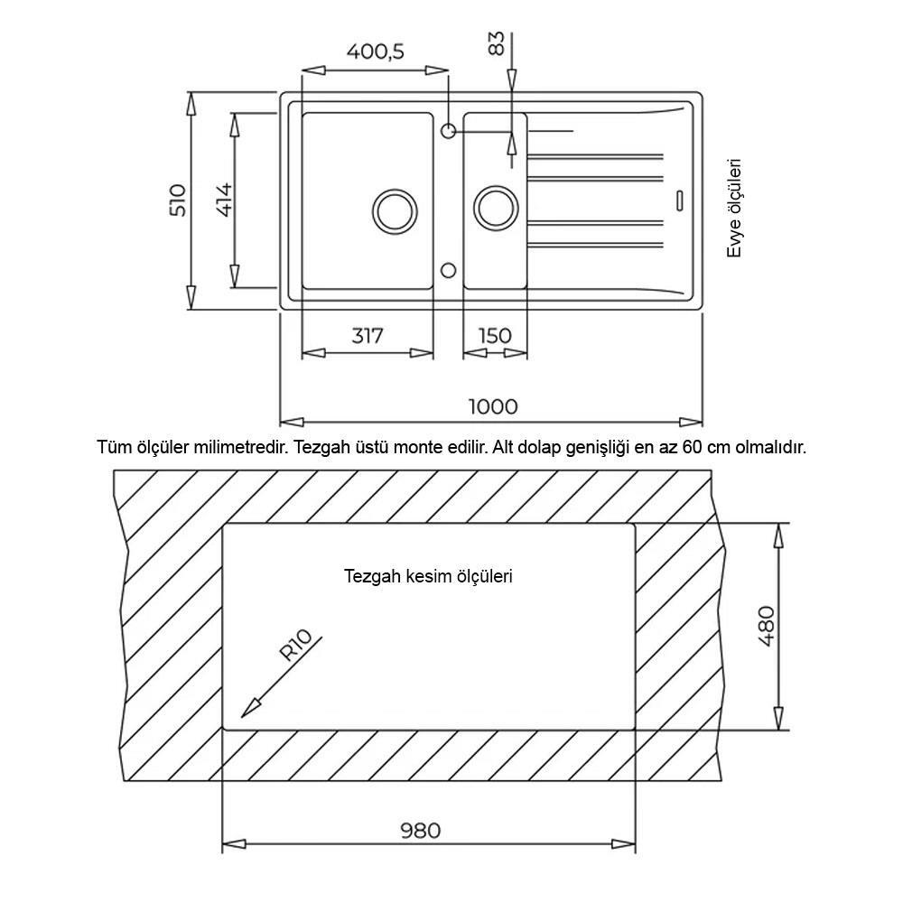 Önemli Not: Evye ürünlerinin montajı için tezgahınızda eviye ölçülerine uygun kesilmiş montaj alanı olmalıdır. Tezgahınızın montaj için gerekli yeterlilikleri sağlayacak bir malzemeden yapılmış olması ve evyeyi taşımaya uygun kalınlıkta olması gereklidir. Evye montajı ve seçimi konusunda bilginiz yok ise mutlaka satış temsilcilerimiz ile birlikte ürün seçimi yapınız.