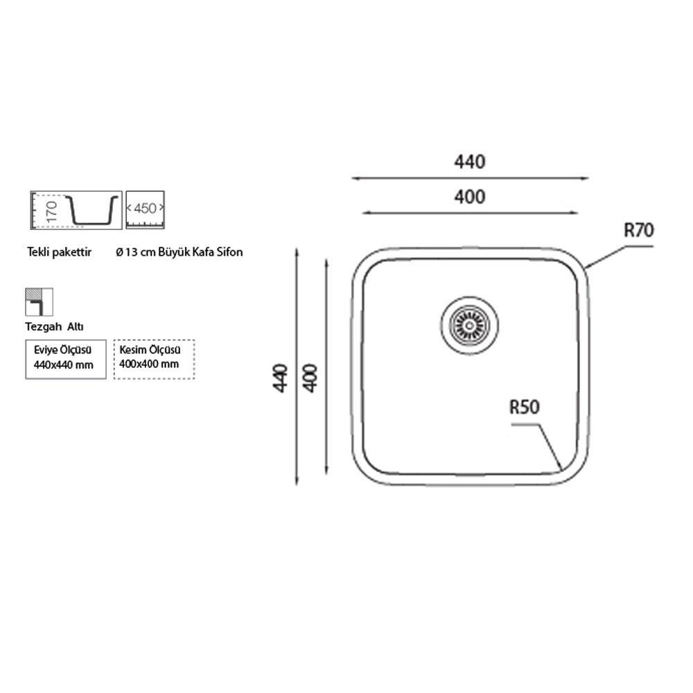 Tezgah altı montaj için kesim ölçüsü; 400 x 400 mm,