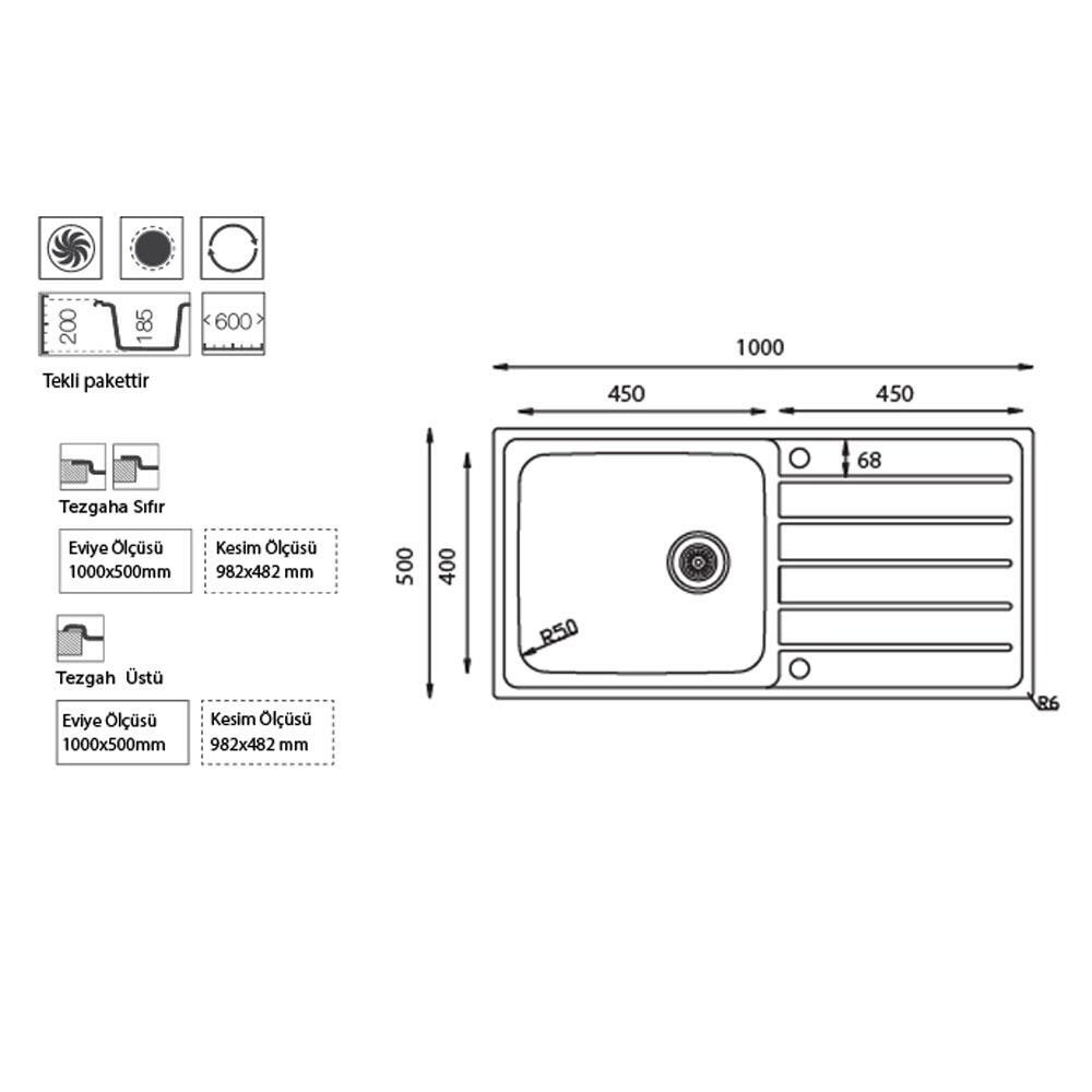 Tezgaha üstü montaj için kesim ölçüsü; 982 x 482 mm,
