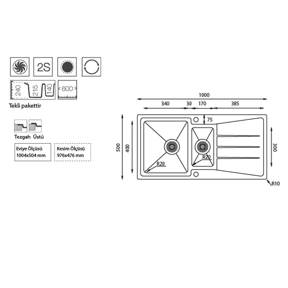 Tezgaha üstü montaj için kesim ölçüsü; 976 x 476 mm,