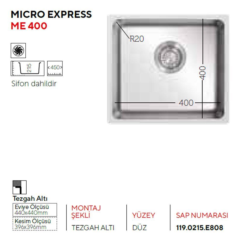 Ukinox ME 400 Paslanmaz Çelik Evye, Tezgah Altı, Tek hazne, 40x40cm
