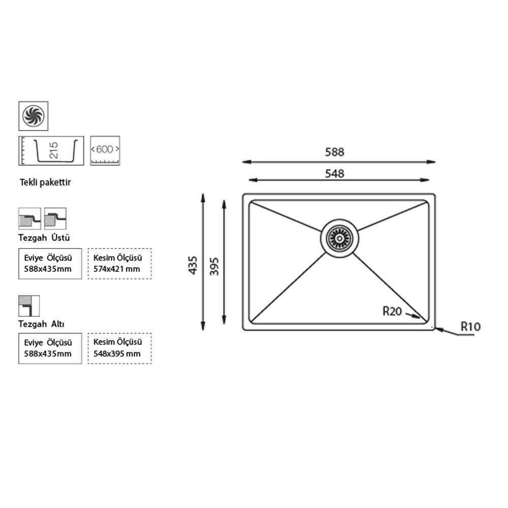 Tezgah altı montaj için kesim ölçüsü; 548 x 395 mm,