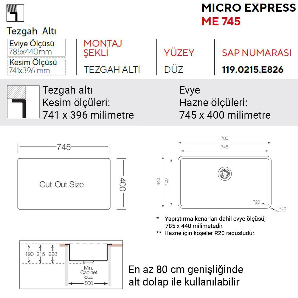 Tezgah altı montaj için tezgah kesim ölçüsü; 741 x 396 mm,