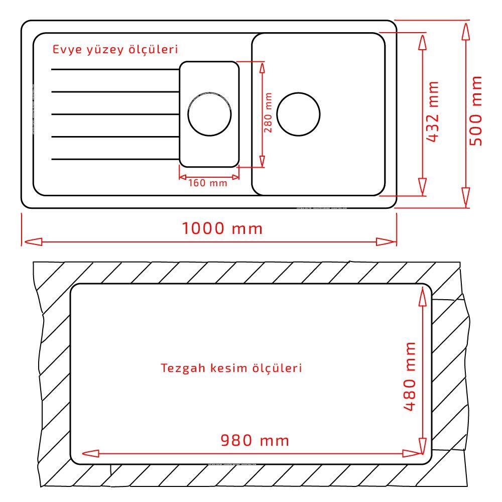 - Tezgah Üstü Ölçüleri: 1000 mm x 500 mm (100x50 cm)
